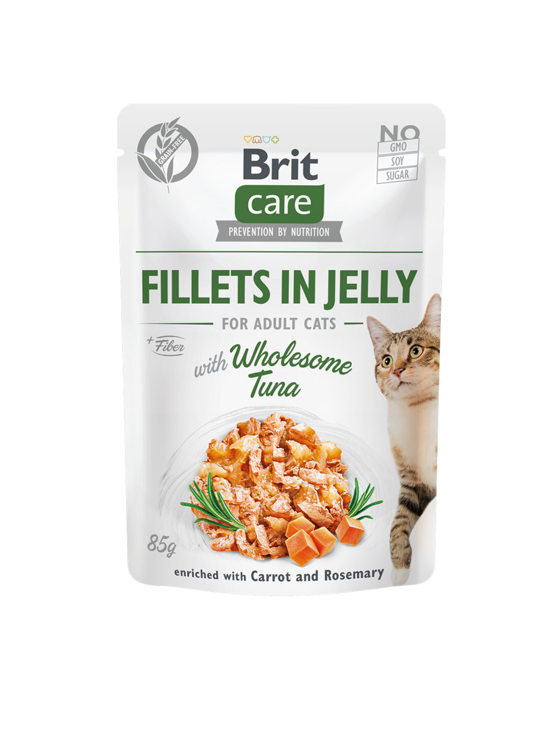 Filets de chat en gelée avec du poulet et du thon sélectionnés. Enrichi de carottes et de romarin.