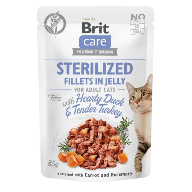 Brit Care Cat Filets stérilisés en gelée avec une dinde tendre et copieuse de canard. Enrichi de carottes et de romarin.