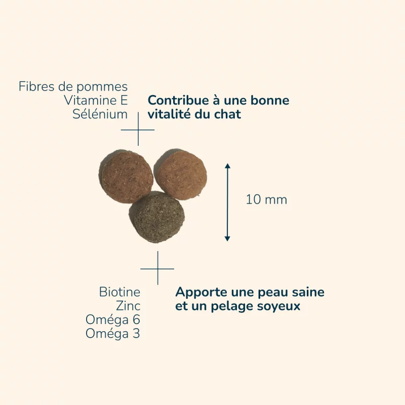 Une peau saine et un pelage soyeux grâce à l’incorporation de biotine et de zinc, et à un apport optimal en acides gras essentiels oméga 6 et oméga 3.