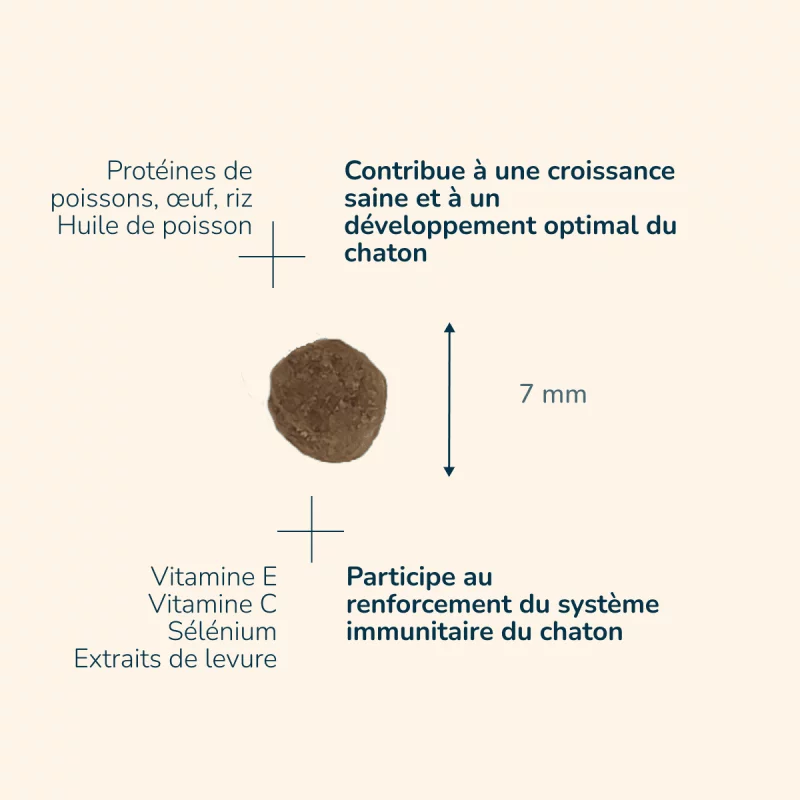 La combinaison d’ingrédients hyper-digestibles (protéines de poissons, œuf, riz) et d’huile de poisson (riche en oméga 3), associée à un apport énergétique élevé et des teneurs adaptées en calcium et en phosphore, contribuent à une croissance saine et à un développement optimal du chaton.
